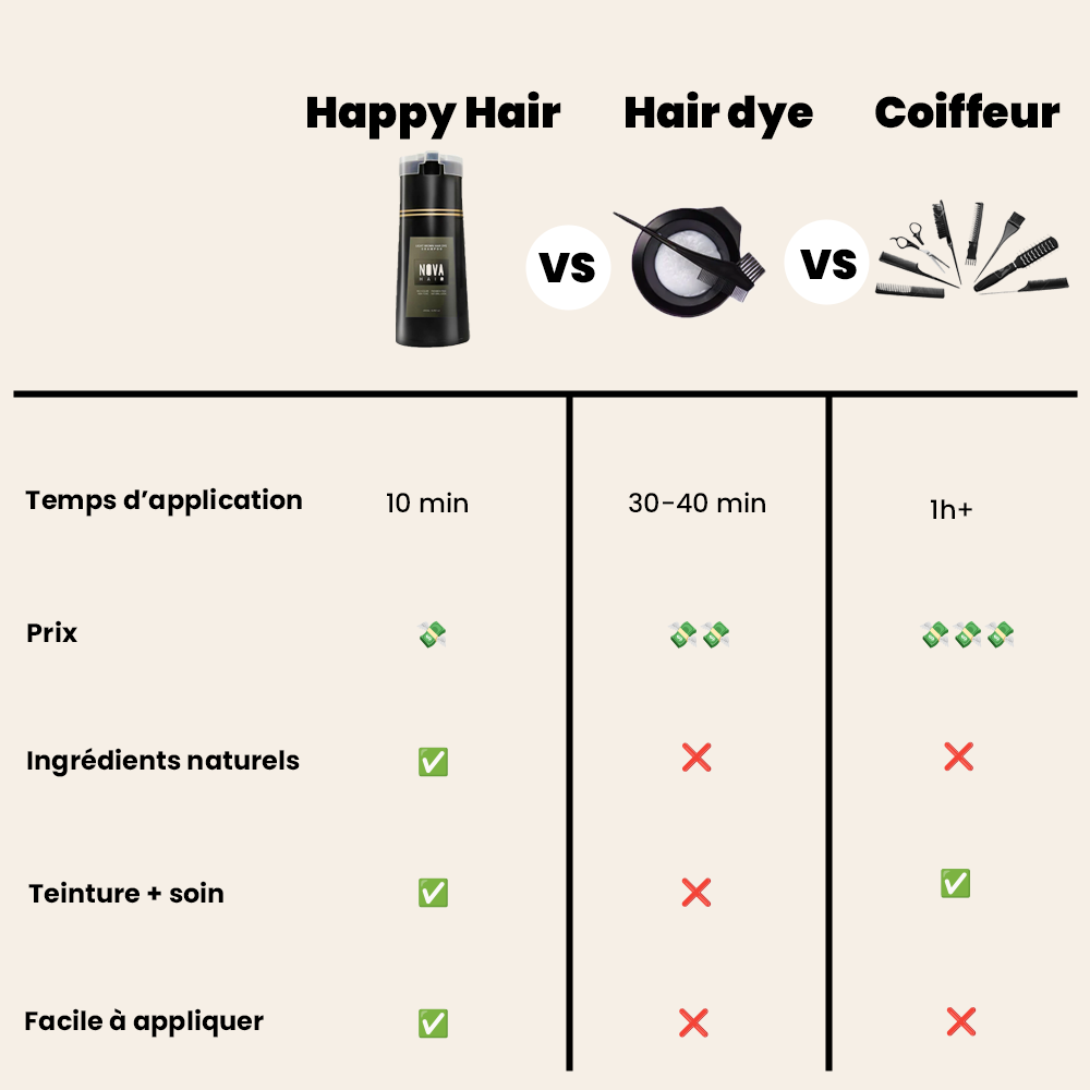 Une teinture rapide, sans les contraintes des produits traditionnels. Happy Hair colore, nourrit et renforce vos cheveux en une seule application, sans taches ni odeurs désagréables.