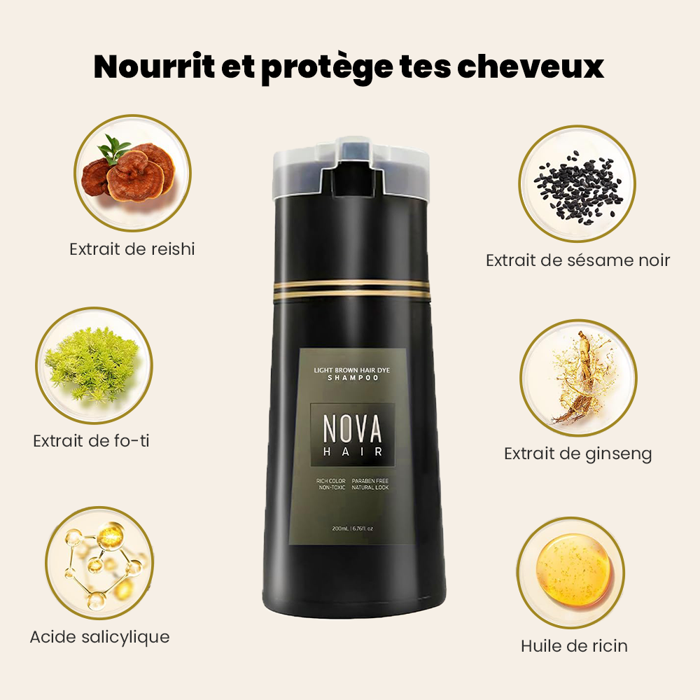 Contrairement aux colorations agressives, Nova Hair est enrichi en extraits végétaux comme le ginseng, le sésame noir ou le champignon reishi. Résultat : des cheveux brillants, souples, et surtout en meilleure santé. Pas d’ammoniaque, pas de sensation de sécheresse ou de cuir chevelu qui gratte. Juste une couleur qui tient bien, et des cheveux bien nourris.